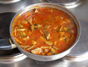 Подготовленные продукты положить в глубокий сотейник, залить соусом, добавить лавровый лист, перец горошком, накрыть крышкой и тушить при слабом кипении 15-20 минут.