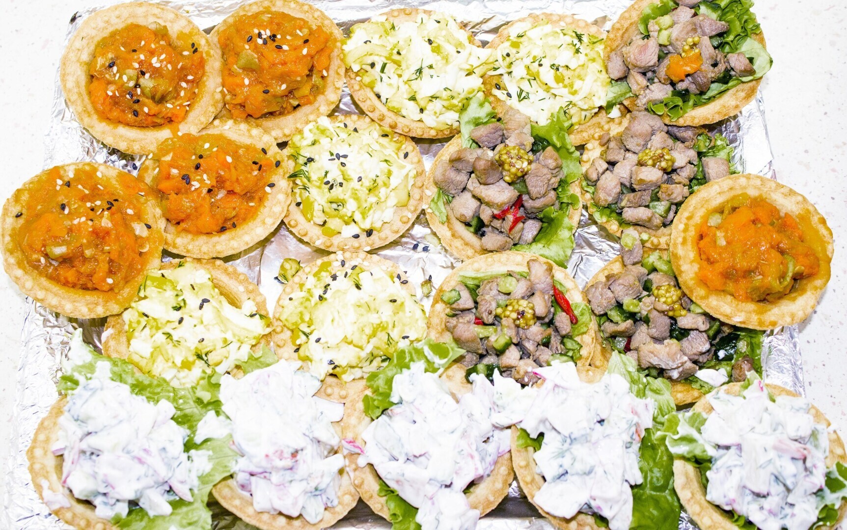 29. В предпоследние пять тарталеток укладываем кабачковую икру. Оставшиеся тарталетки заполняем овощным салатом, выложив на дно листья салата. Тарталетки со свининой украшаем зернами горчицы. Сырно-яичную и кабачковую начинку посыпаем сверху кунжутом. Подавать тарталетки с начинкой можно сразу после приготовления
