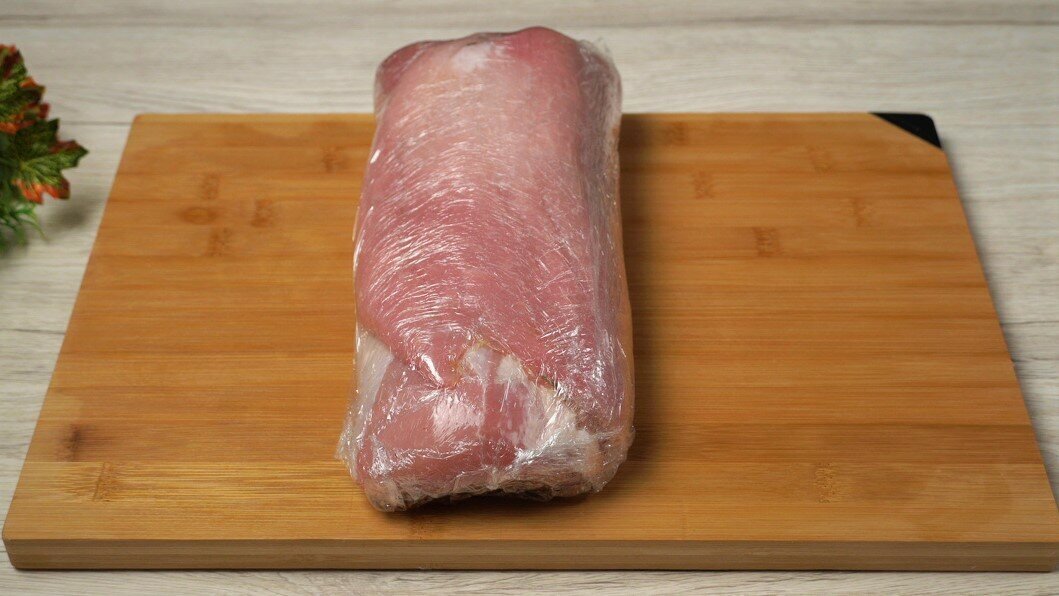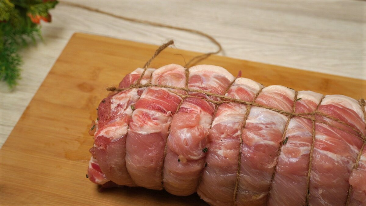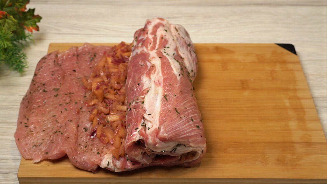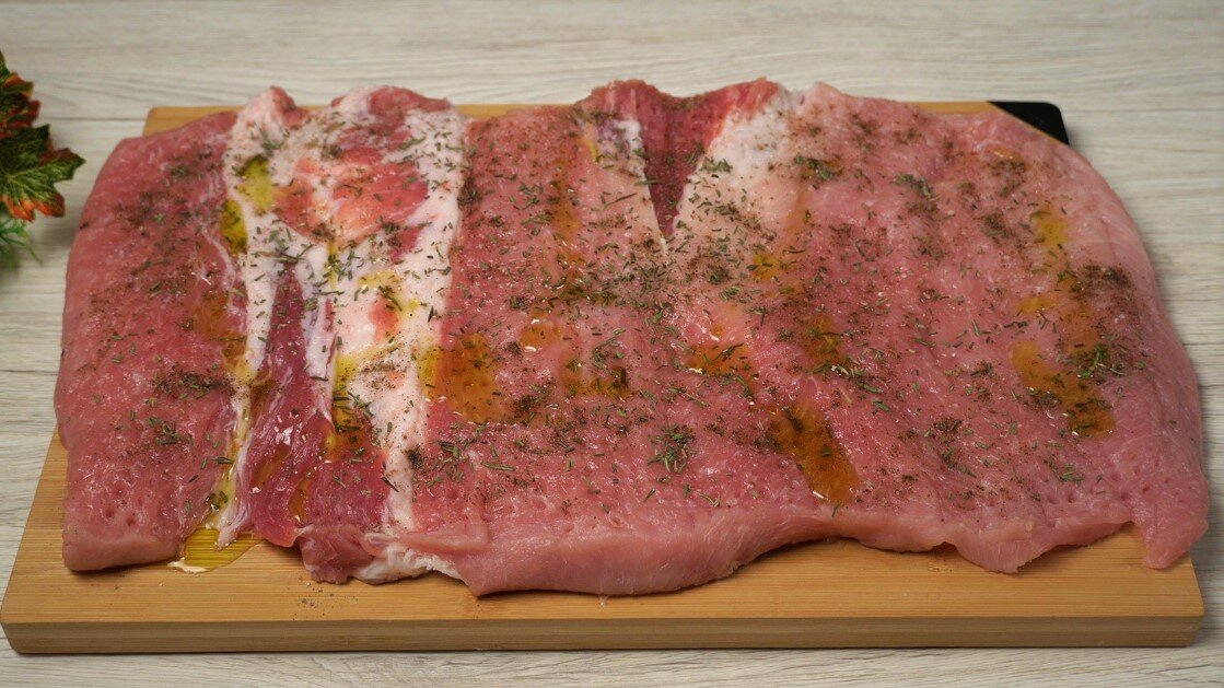 Свиной карбонад разрезаем так, чтобы получился пласт. Сверху кладём пищевую плёнку. Затем отбиваем его. Карбонад нужно посолить. Также добавляем чёрный перец. Затем нарезаем розмарин. Посыпаем им наш пласт карбонада. Наливаем оливковое масло. Размазываем. Сворачиваем пласт в рулет. Убираем его на 2-3 часа.
