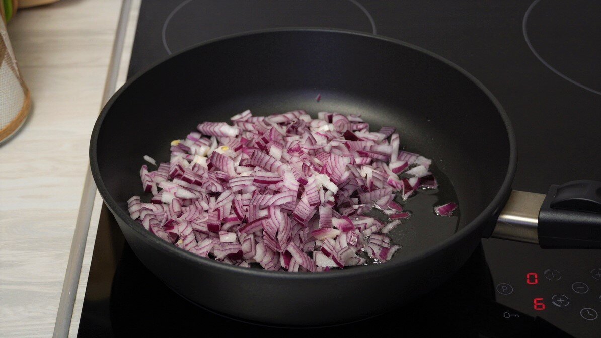 На сковороду наливаем растительное масло. Лук очищаем и нарезаем мелкими кусочками. Обжариваем его.