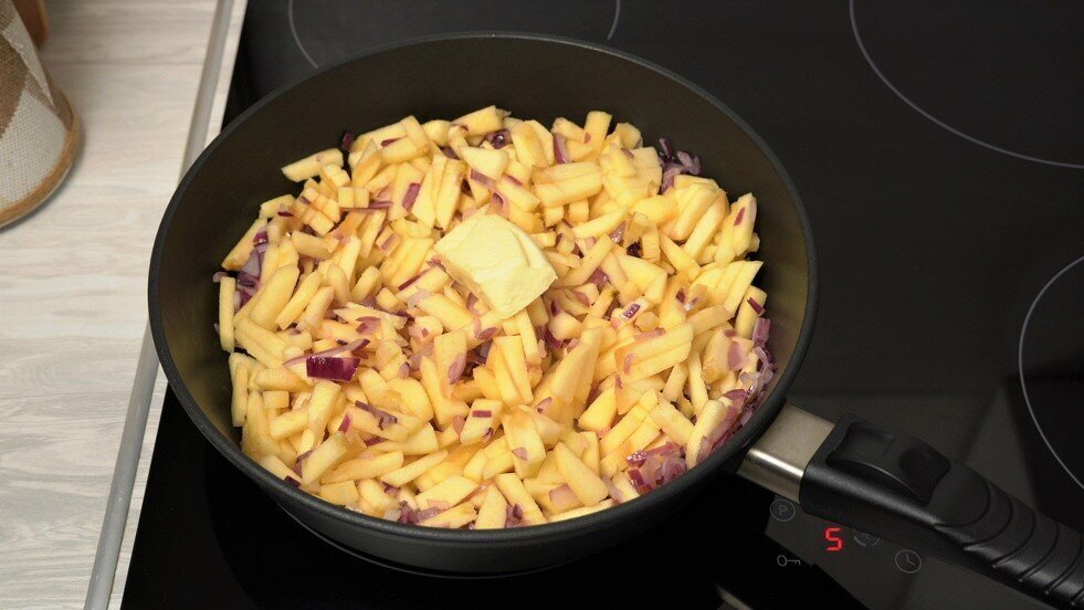 Яблоки очищаем от кожуры и нарезаем их мелкими кусочками. Обжариваем их с луком. Добавляем сливочное масло. Перемешиваем.