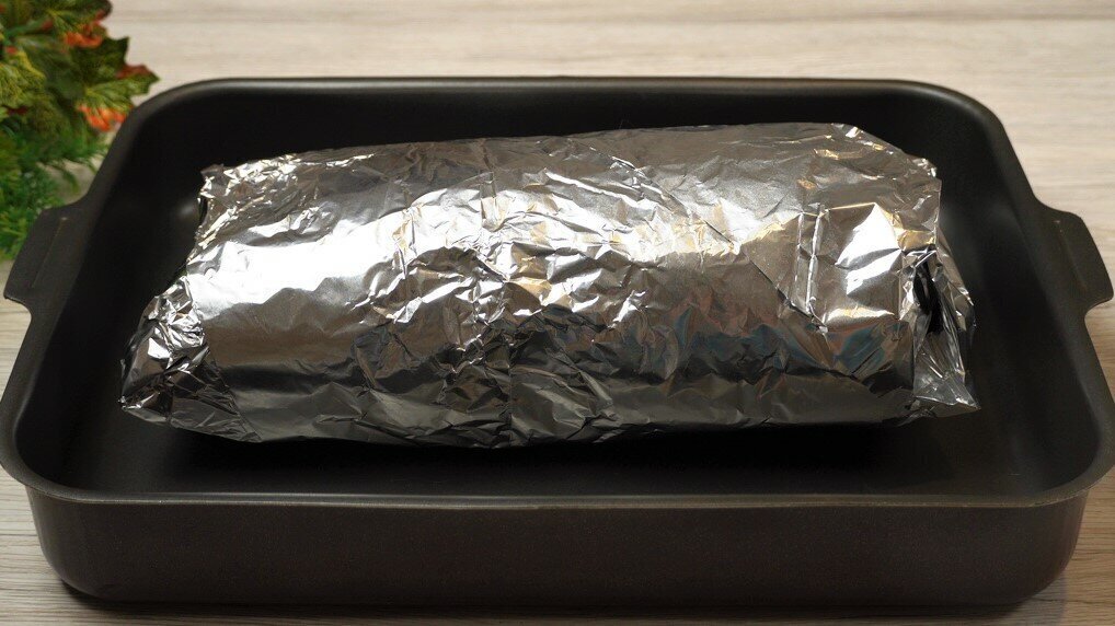 Заворачиваем наш рулет в фольгу. Кладем на противень и запекаем 1 час при t 180°.
