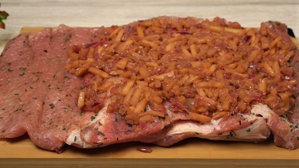 Имбирь натираем на тёрке. Добавляем к яблокам и луку. Мешаем. Добавляем соль и сахар. Тщательно перемешиваем. Наливаем яблочный уксус. Добавляем пиво. Добавляем корицу. Перемешиваем. Тушим до испарения жидкости. Выкладываем равномерно нашу начинку на пласт карбонада.