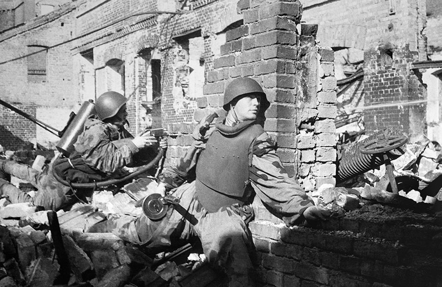 Советские воины-огнемётчики ведут бой за город Кюстрин