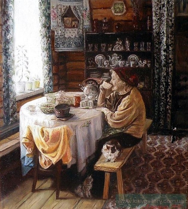 И смотрит голубоглазо. И ржаную корочку жуёт.