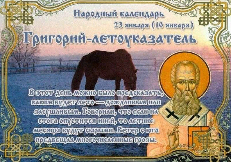 На Руси 23 января называли Григорием-летоуказателем. Праздник получил такое название, потому что по погоде в этот день крестьяне пытались предсказать, каким будет лето — дождливым или засушливым.