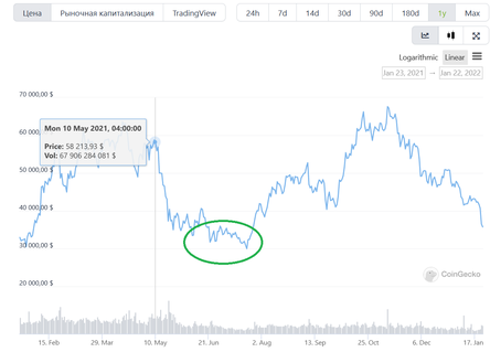 Цены, мягко говоря, чудовищные, и что самое страшное, к ним начинаешь привыкать. Но судя по множеству признаков, цены так и продолжат снижаться и сейчас я объясню почему. Летом 2021 года, после резкого обвала криптовалют, цены на видеокарты очень быстро начали снижаться и GeForce RTX 3060 можно было купить в конце июля за 50 с небольшим тысяч рублей. А ведь еще в июне они доходили до средней цены в 110000-130000 рублей. Все становится ясно, если посмотреть на график биткоина летом 2021 года.