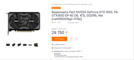 Но давайте посмотрим, к каким ценам в результате этих проблем мы пришли в январе 2022 года. В Ситилинке как раз началось снижение цен на видеокарты, достигающее до 15% на некоторые модели. Palit GeForce GTX 1050 Ti StormX 4G, недорогая модель, обеспечивающая минимальный уровень игровой производительности в 2022 году, стоит 23880 рублей.