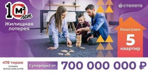 478 тираж Жилищная лотерея 23 января 2022 года снова разыграла между участниками квартиры. Столото предоставило возможность выиграть квартиру эквивалентной стоимостью 5 миллионов рублей. Также тысячи участников выиграли денежные призы от накопленного призового фонда. У каждого был шанс сорвать суперприз 700 миллионов рублей. Розыгрыш прошел до 86 хода и в лототроне осталось 4 шара.