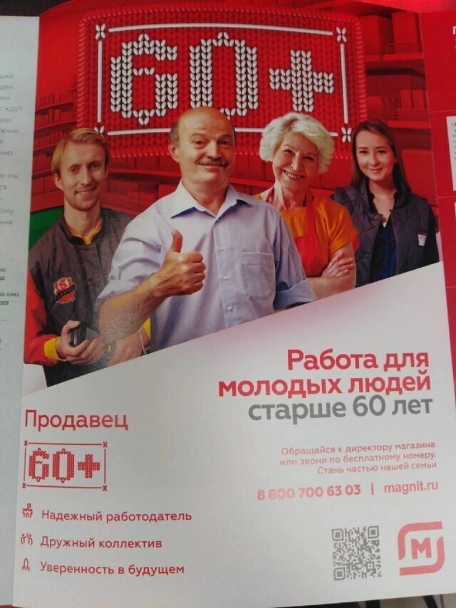 Похоже, очередь за забором закончилась... Магнит» запустил рекламную кампанию «Работа для молодых людей старше 60 лет». С ее помощью бренд хочет привлечь на работу пожилых людей.