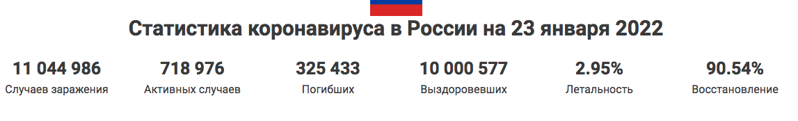 По последним данным статистики оперативного штаба на 23 января 2022 в России, лабораторно подтверждено — 11 044 986 случаев заражения коронавирусом COVID-19, из них полностью выздоровели — 10 000 577 пациентов, зафиксировано смертей от коронавируса — 325 433 человек. По официальной статистике коронавируса в России, в период с 22 по 23 января 2022 количество заболевших COVID-19 — 0, выздоровлений — 0, смертей — 0.