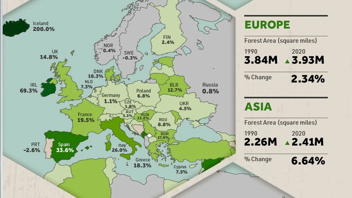 Друзья, на прошедшей неделе увидел интересное исследование ООН по изменению площади лесов на планете. Представлена динамика за последние 30 лет. Сейчас площадь лесов составляет 31% от площади суши и за 30 лет эта площадь уменьшилась на 4%. Площадь лесов принципиально важна для "зеленой" повестки и я честно говоря, что Германия и США будут здесь впереди планеты всей. Ведь именно эти 2 страны усиленно "топят" за переход на "зеленую" энергетику.