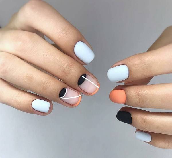 Можно дополнить рисунками фруктов или яркой графикой. Отлично подходят для создания данного маникюра оранжевого, салатового, бирюзового, кораллового оттенка.