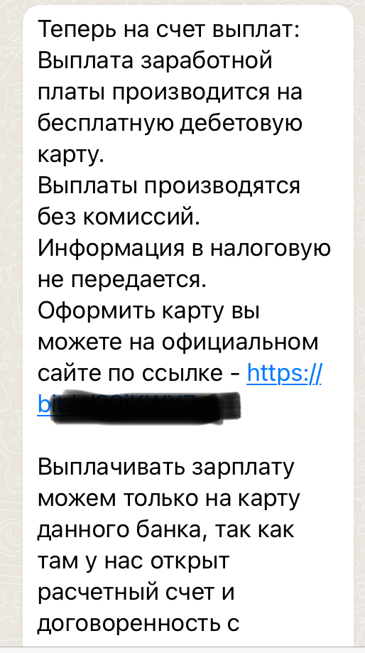 Деятельность предлагают любую. Итог один: присылают ссылку, где нужно совершить какие-то финансовые действия. Причем вы работать с ними даже еще не начали. И это не обязательно перевод денег. Например, оплата только на карту банка N, оформите по партнерской ссылке. А если у вас такая есть, нужна еще одна, которую оформите по нашей ссылке, пожалуйста. Не смотрите, что сайт защищен – это уже давно не показатель. Как усилитель используют момент, что оплата ежедневная. А при оформлении карты начнутся танцы с бубном – привяжите основную карту, это необходимо для … . Или заполните всю возможную информацию о себе, паспортные данные, номер, потом код подтверждения, а потом у вас микрозайм.