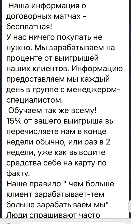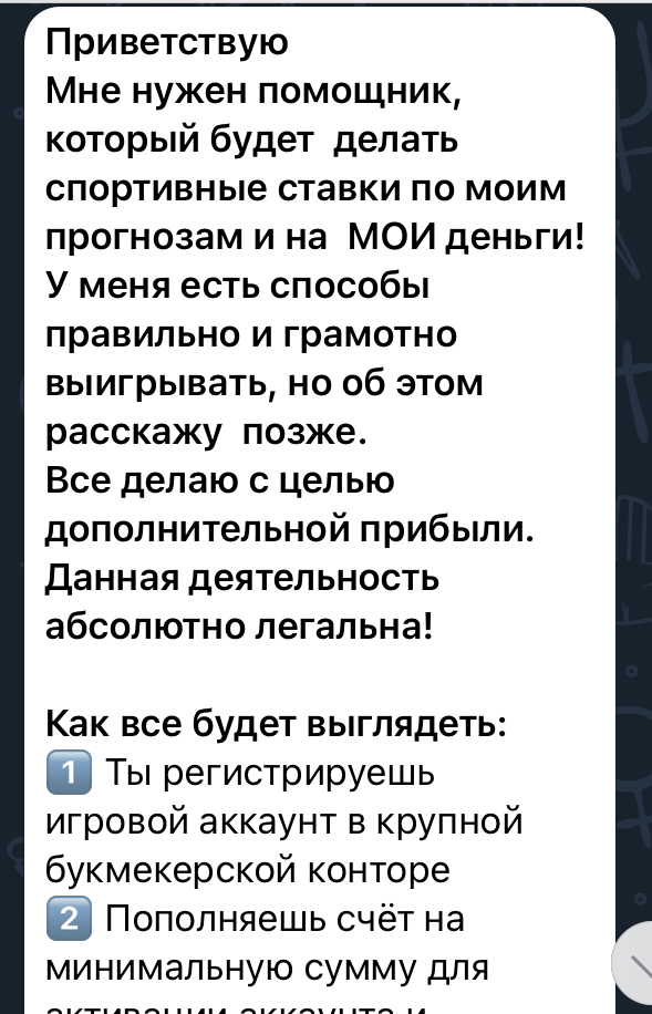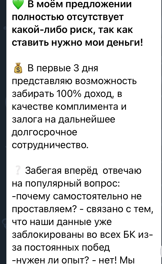 1. «Ставки на их деньги». История стандартная: всех букмекеров разорил, его везде заблокировали и набирает ассистентов, которые ставят за него. Оплаты щедрые, процентов 10–15 ему, остальное вам. Первые дни себе 100% оставляете. Россия, щедрая душа. Сразу в бан! Пример ниже.