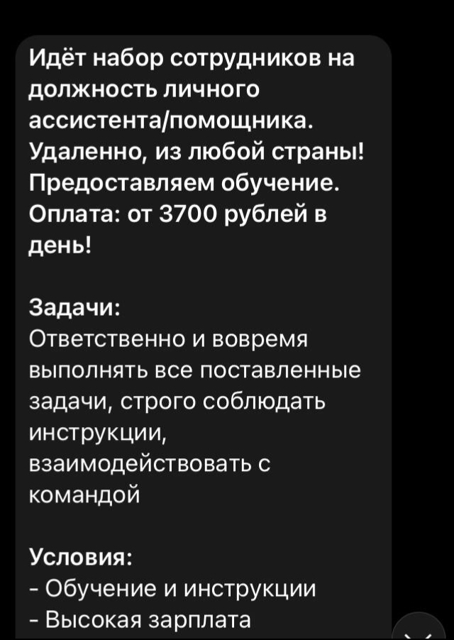 Спасибо за ваш комментарий! И так действительно случается. Вариантов разных много, всех и не перечислить, конечно. Главное никаких переводов от себя и личных данных, даже если это реальные работодатели (а вдруг?😅) - все равно лучше перестраховаться и обходить все подобное стороной👍🏻