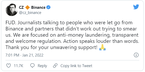 Чанпэн Чжао назвал расследование агентства FUD. По его словам, журналисты пытаются очернить компанию, «общаясь с людьми, которых уволили из Binance, и партнерами, у которых не сложились отношения с биржей».