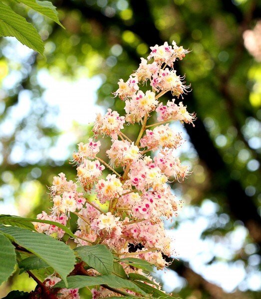 Цветущий каштан очень вкусно и сладко пахнет, поэтому его так любят насекомые-опылители. Обычно цветки белого цвета с желтоватой серединой, но можно увидеть и розовые каштаны.