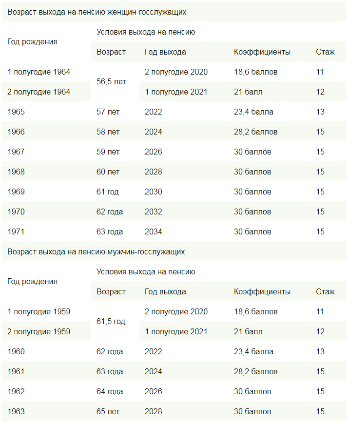 Для госслужащих переход к новым значениям пенсионного возраста тоже происходит поэтапно. До 2021 года у них свой темп – ежегодно пенсионный возраст повышается на 6 месяцев, а далее синхронизируется с общим темпом и растет по 1 году в год. Мужчины-госслужащие к 2028 году будут выходить на пенсию в 65 лет. Для женщин ситуация хуже – вместо общепринятого возраста в 60 лет они будут выходить на пенсию в 63. Рассмотрим эту информацию в виде таблицы.