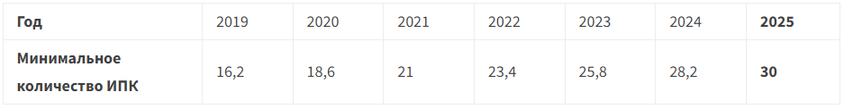 Необходимое количество ИПК для оформления выплат в течение переходного периода можно определить, воспользовавшись следующей таблицей по годам: