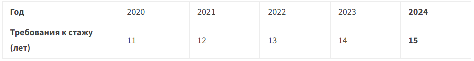 Требования к минимально необходимому стажу с 2020 года в России представлены в таблице ниже: