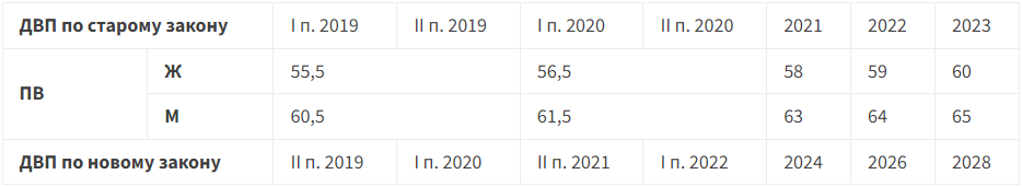 С учетом этих изменений таблица пенсионного возраста по годам по новому закону приводится в таблице ниже: