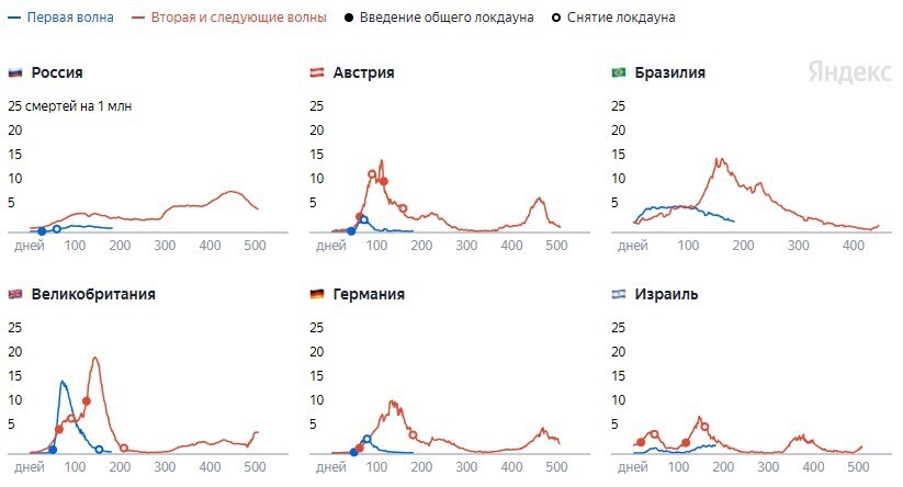 Для каждого дня показано число новых смертей от коронавируса на миллион человек (скользящее среднее за 7 дней). За начало первой волны принято 1 февраля (в Израиле и России — 1 марта, в Бразилии — 1 мая), за начало второй — 1 сентября (в Бразилии — 1 ноября).