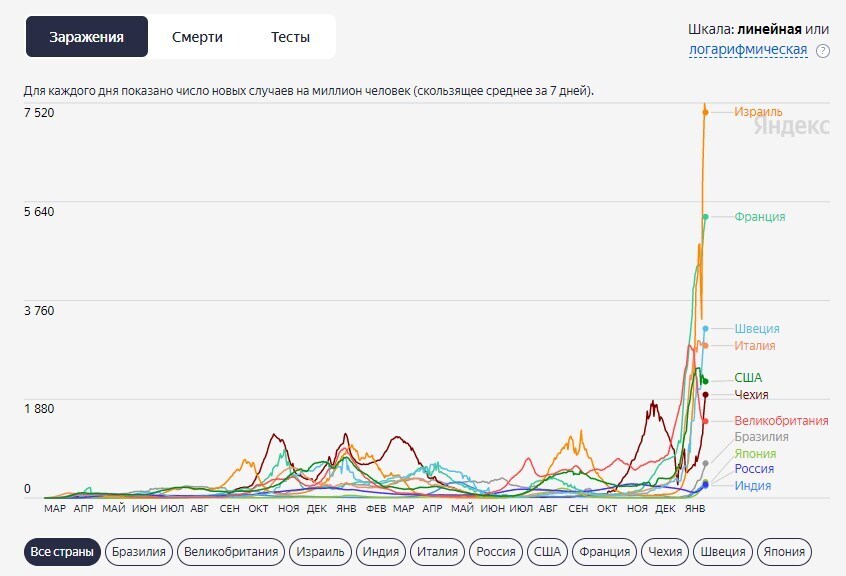 В этом блоке можно следить за динамикой новых случаев смерти от коронавируса в некоторых странах Западной Европы, США, Израиле и России. В отличие от числа заражений показатель смертей нечувствителен к изменению числа тестирований, поэтому он лучше подходит для сравнения волн заболевания.