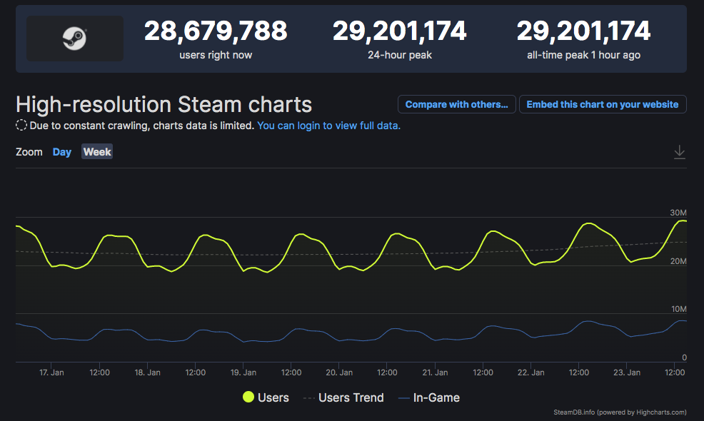 Пару недель назад, 9 января, в Steam был установлен очередной рекорд по количеству одновременных пользователей. Значение впервые превысило 28 миллионов человек. Сегодня сервис Valve пошел еще дальше.