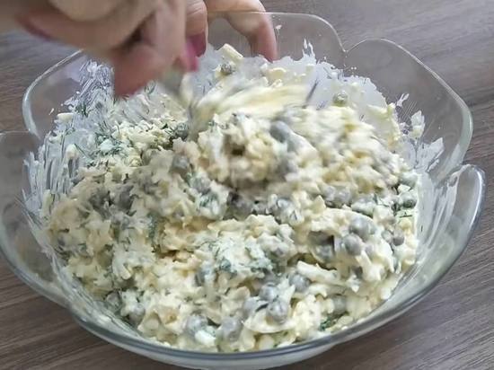 Для начала нужно отварить два яйца, почистить и нарезать кубиками. Затем, так же кубиками, нужно нарезать 100 г сыра. Взять можно любой – твердый или плавленый. Добавить 4 столовых ложки консервированного горошка и измельченную зелень: укроп, петрушку. Все это тщательно перемешать, добавить майонез, еще раз перемешать – и можно подавать.