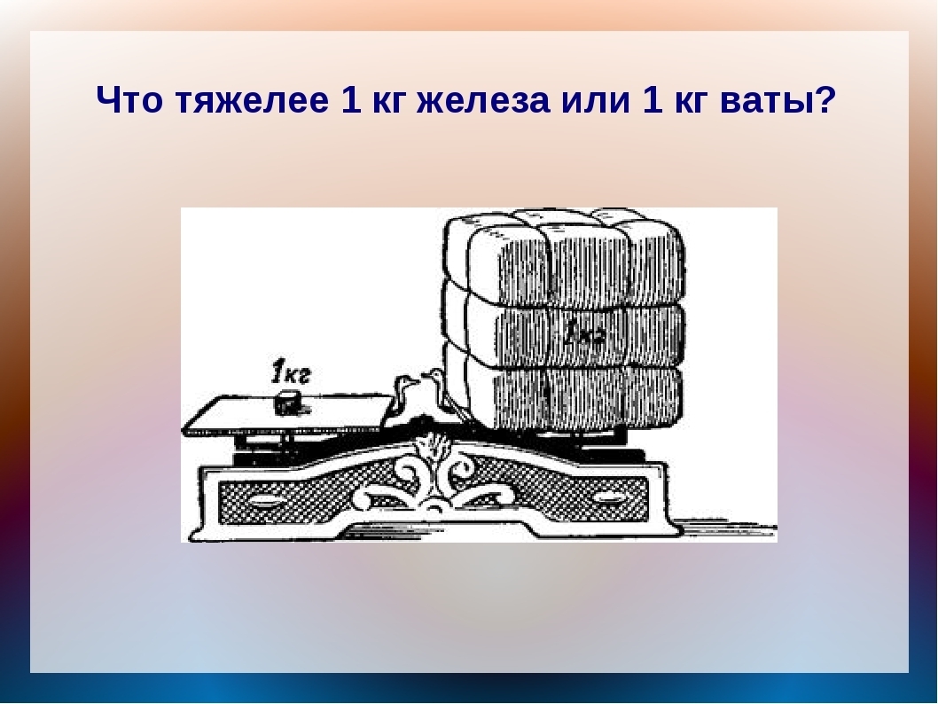 А если серьезно, то, возможно, для лучшего понимания было бы правильнее, - "Что покажут весы при взвешивании 1 кг(с) железа и 1 кг(с) ваты в вакууме, на воздухе или в пресной воде?" Источник фото: infourok.ru