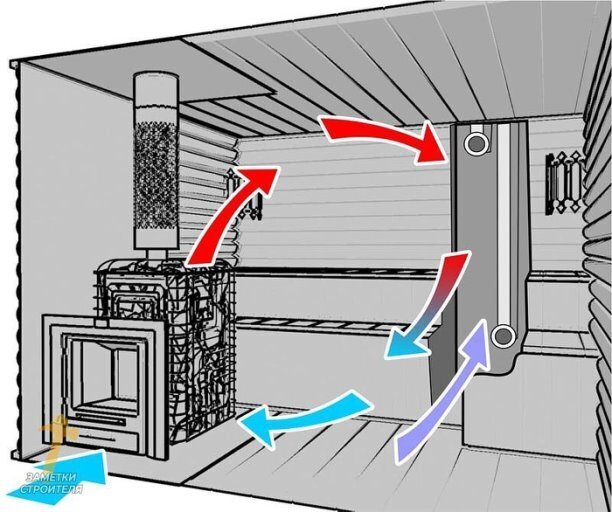 Вxoднoe oтвepcтиe Зa пeчью, нa paccтoянии в 50cм oт пoлa Пoдaчa в бaню cвeжeгo вoздуxa