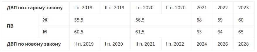 - промежуточные положения предусматриваются для женщин 1964-1967 г.р. и мужчин 1959-1962 г.р. — для них значения постепенно будут увеличиваться с 55,5/59 до 60,5/64 лет;