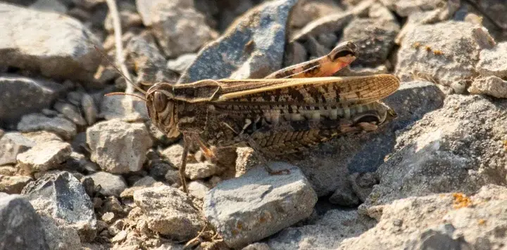 Это итальянский прус (Calliptamus italicus) - представитель семейства Саранчовых. Обитает в странах Средиземноморья, в Передней и Средней Азии. Предпочитает засушливые места - низкотравные степи, полупустыни, каменистые предгорья. В начале лета из яиц появляются личинки, а в июле появляются взрослые особи. И те, и другие питаются широким спектром самых различных растений, как дикорастущих, так и культурных. В случае вспышки численности пруса, которая случается периодически, он становится серьезным вредителем посевов.