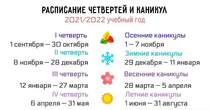 Хотя школы и вправе сами устанавливать график школьных каникул, однако большинство из них придерживаются рекомендаций Минпросвещения. Вероятнее всего, что ваша школа тоже установит школьные каникулы в эти дни*:...
