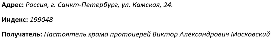 После написания записки ее необходимо "передать" святой. Его необходимо отнести к месту захоронения святой Ксении. Если по каким-либо причинам отнести письмо к могиле вы не можете, его можно отправить или отнести в храм в вашем городе, предварительно уточнив у работников церкви, предусмотрен ли для таких писем в святом месте свой уголок. Отправить письмо можно по следующему адресу: