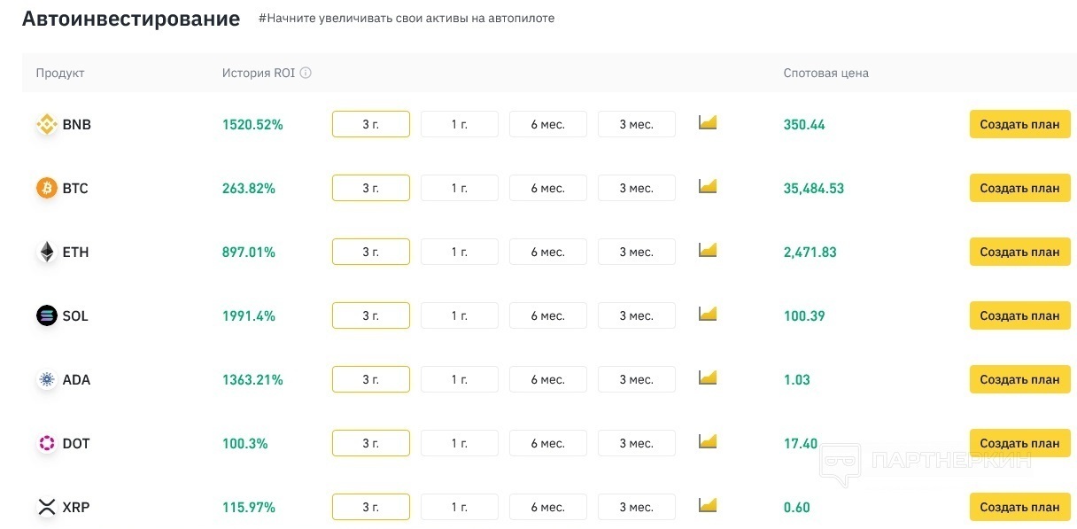 Как видим, периоды открытия планов для автоинвестирования бывают разные: от 3 месяцев до 3-х лет, потому на дистанции, нужно выбирать такую криптовалюту у которой есть огромный потенциал роста и нам не важно, сколько будет стоит эта криптовалюта через 3 мес или 3 года — главное что мы приумножим ее количество. Так же видим в этой условной таблице такие данные как продукт — это собственно криптовалюта, которую вносим на автоинвестирование,, дальше видим «История ROI» — это исторические параметры доходности, которые базировались на прошлой аналитике, но не говорят о будущем профите. Ну и остался параметр под названием «Спотовая цена» — это цена определенной криптовалюты в данный момент времени, другими словами, это цена в $ на покупку этой крипты. По факту, главная цель этого инструмента — приумножить количество вашей крипты. Тогда возникает логичный вопрос, какие же перспективные криптовалюты, которые представлены в этом списке? Согласен, вопрос действительно хорош и актуален, потому предлагаю ответить на него более подробно.