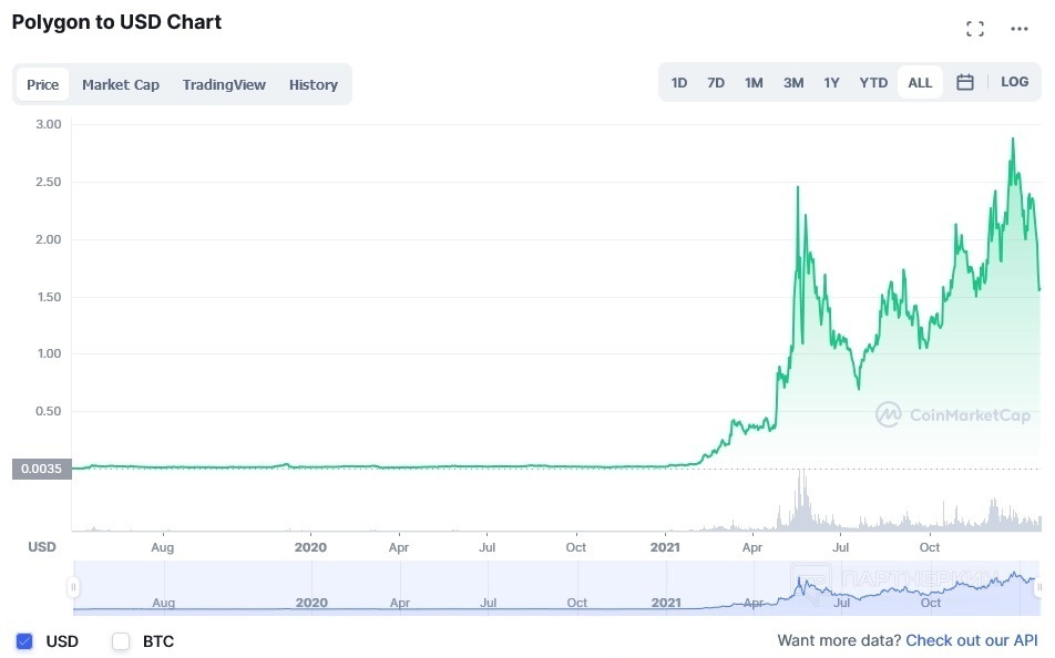 Так что при любой цене, выгода очевидна, если понимаем тот факт, что автоинвестирование дает профит в виде дополнительного количества криптовалюты. На момент написания этого поста, стоимость монеты «Polygon (Matic)» равна $1,58, но это даже хорошо — дешевле будет зайти в эту монету, или другими словами — дешевле будет купить на бирже эту монету под эту возможность автоинвестирования. Дальше предлагаю взглянуть на график цены этой криптовалюты и понять, выгодно будет ее купить и забросить на автоинвестирование или нет.