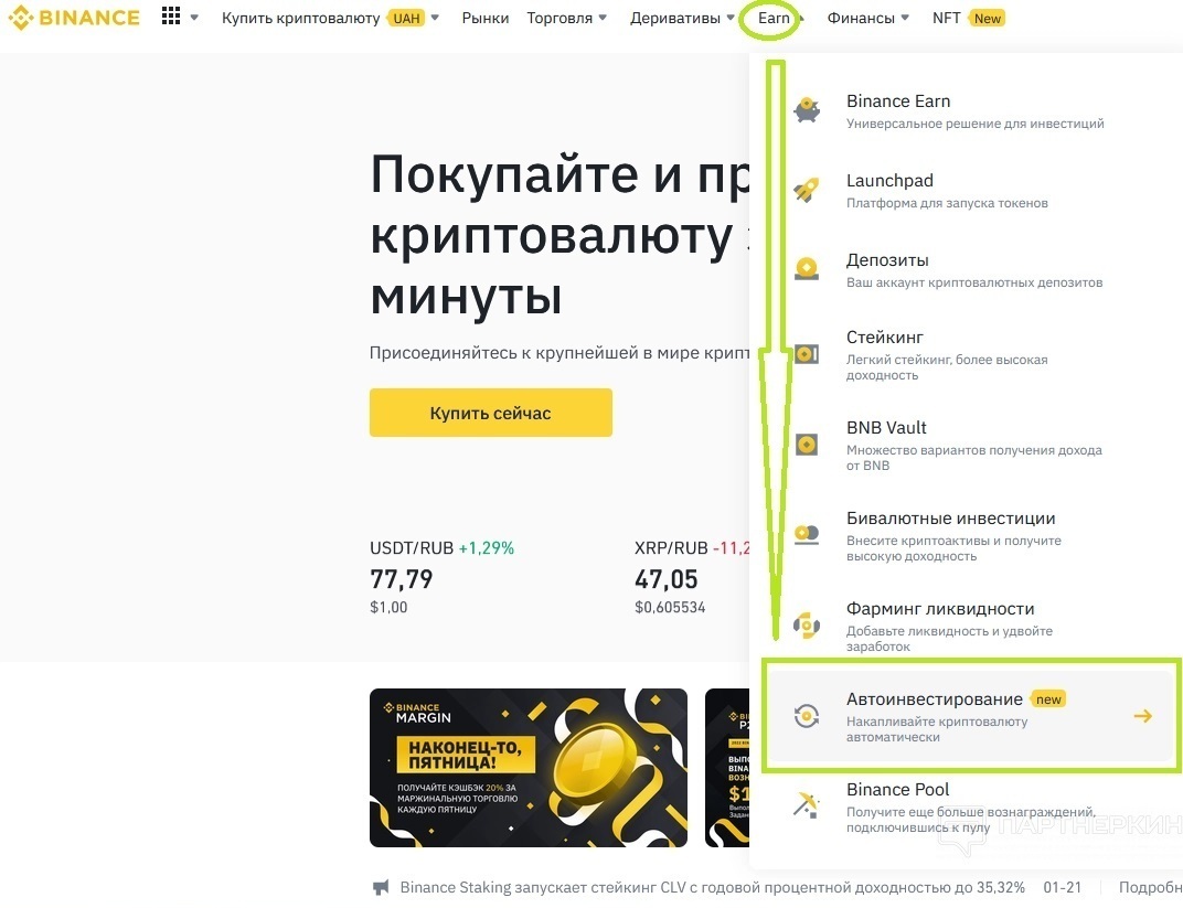 Переходим на платформу, логинимся и кликаем на раздел «Earn» и дальше выбираем вкладку «Автоинвестирование». Этот инструмент дает возможность накапливать определенную криптовалюту в автоматическом режиме.