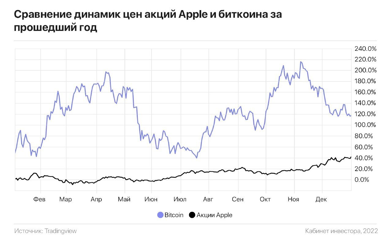 Если взять временной период с 1 января до 31 декабря 2021 года, то на финише акции яблочной компании выросли на 40%, обогнав биткоин с его 38%.