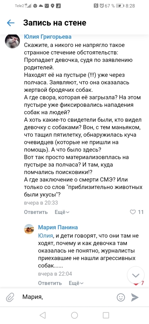 Находят её на пустыре (!!!) уже через полчаса. Заявляют, что она оказалась жертвой бродячих собак.