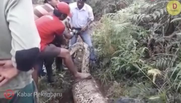 Местные жители нашли необычайно раздувшуюся змею около восьми метров в луже на пустыре в округе Букит-Бату, провинция Риау, Суматра. Так как вместо человека он проглотил дикую свинью, он решил не убивать, а поймать змею и перевести ее в другое безопасное место, а состояние операции по отлову жителями снимается на видео.