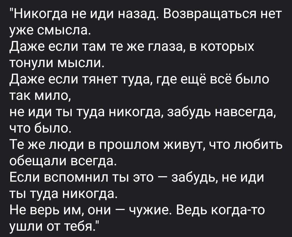 Если вы вспомните старые чувства, будете сомневаться, думать о том, чтоб вернуться, советую перечитать этот стих. А ещё лучше, выучить его наизусть, чтоб в трудную минуту вспомнить, повторить и идти дальше. Ведь только движение вперёд даст нам новую жизнь.