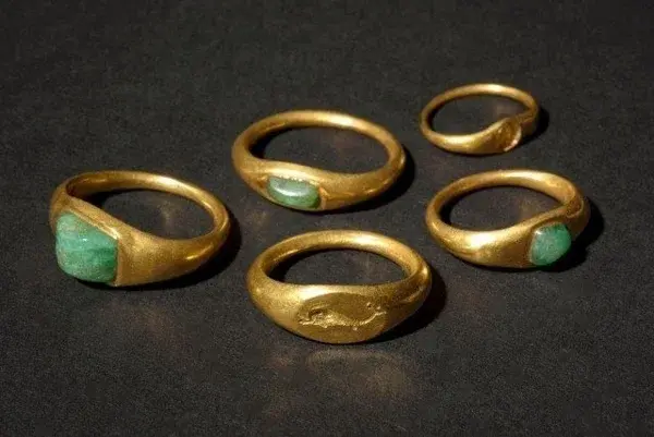 Пять золотых колец-перстней: три из них с изумрудами, в одном камень потерян, еще один — перстень-печатка с изображением дельфина