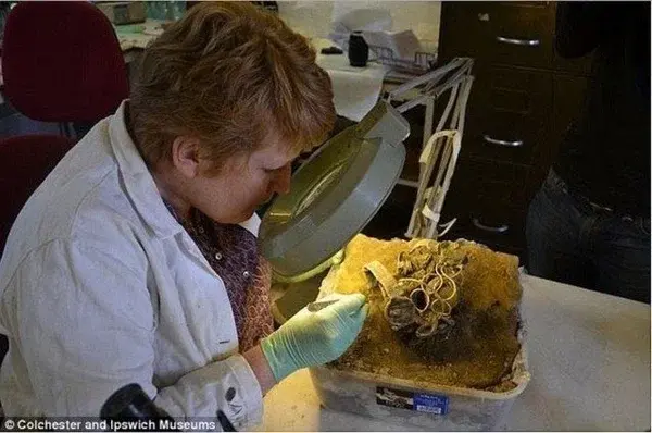 Клад достали из земли целиком вместе с грунтом, дабы не повредить его целостность и отправили для исследования в лабораторию при музее Колчестера и Ипсвича.