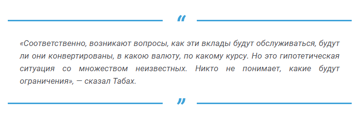 Предложенные США меры действительно могут ставить под вопрос исполнение обязательств российских банков по долларовым вкладам, говорит главный экономист «Эксперт РА» Антон Табах. По его словам, гипотетически, если у банков будут ограничения на покупку доллара, то имеющейся у них долларовой ликвидности может не хватить на удовлетворение всех желающих забрать валюту из банков. Никто из банков не держит наличные доллары в количестве, равном объему долларовых вкладов.