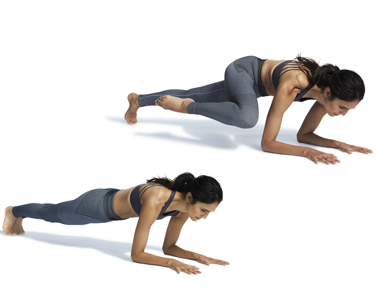 Примите позу планки с опорой на предплечья и мыски (А). Оторвите правую ногу от пола и удерживайте на весу, в нескольких сантиметрах от пола. Согните ногу в колене и притяните его к правому плечу (Б). Вернитесь в исходное положение и повторите. Выполните 10 повторов, после чего смените сторону и выполните еще 10. Это составит 1 подход.