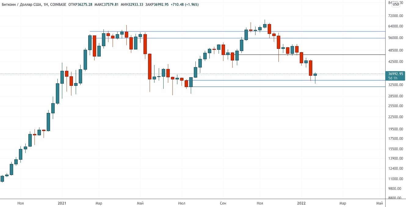 БИТКОЙН У МИНИМУМОВ ДИАПАЗОНА — ТЕХНИЧЕСКИЙ ОБЗОР ОТ 26 ЯНВАРЯ 2022