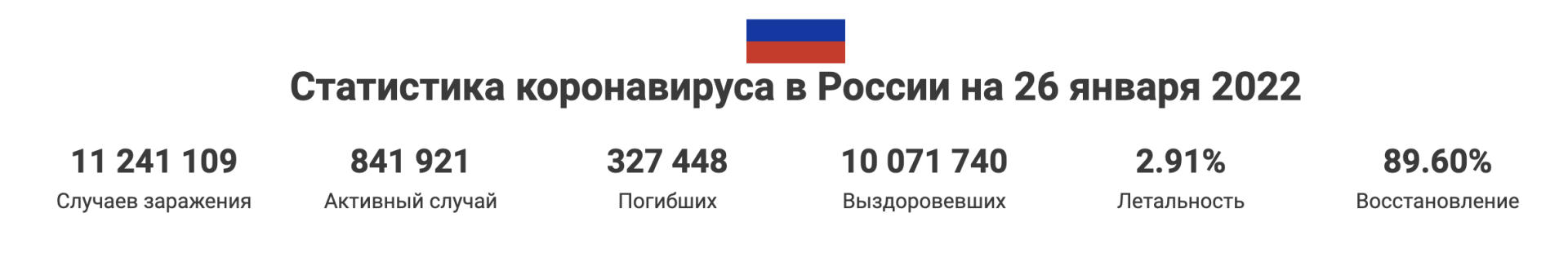 По последним данным статистики оперативного штаба на 26 января 2022 в России, лабораторно подтверждено — 11 240 013 случаев заражения коронавирусом COVID-19, из них полностью выздоровели — 10 070 861 пациентов, зафиксировано смертей от коронавируса — 327 428 человек.