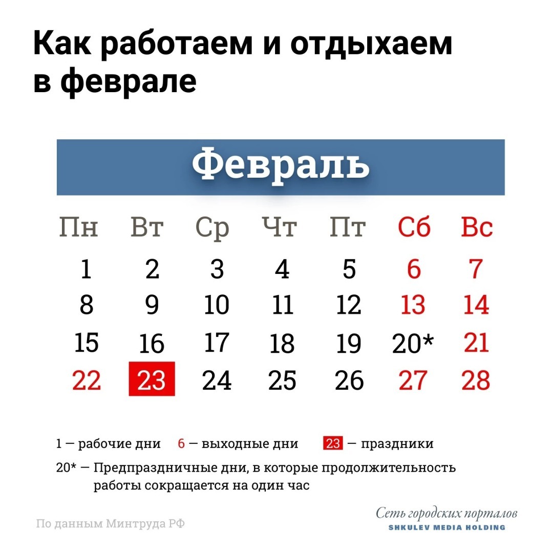 Не закон, но тоже очень важное изменение, которое ждет нас в феврале: из-за Дня защитника Отечества придется отработать лишний день, он выпадает на субботу, 20 февраля. Далее следуют три выходных — с 21-го по 23-е включительно, а в среду, 24 февраля, возвращаемся к станкам и офисным стульям.